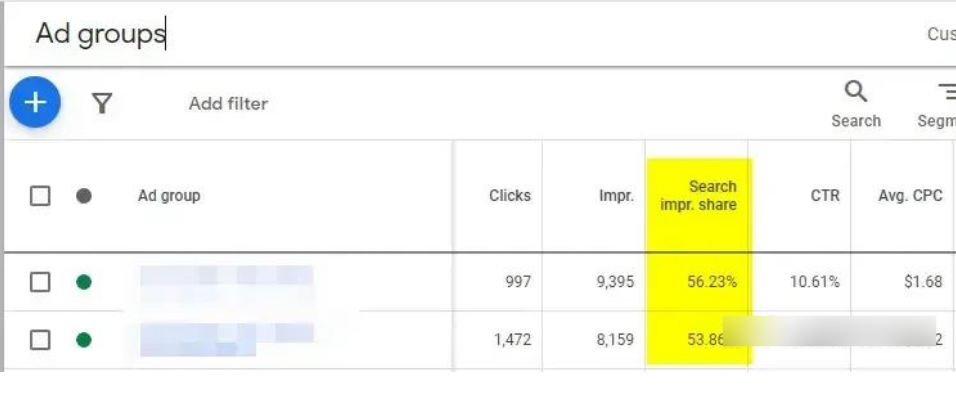 如果你的投放已經比較穩定,想要通過提高出價去獲取更多流量,這個時候可以去看一項很有意義的數據- 展示份額(Impr.share)。如圖: