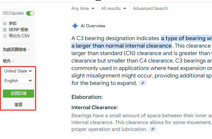 方法二:安裝一個谷歌瀏覽器擴展插件,SEOquake。安裝好之后啟用它,這樣在瀏覽器的左側就可以看到下圖設置,在地方這里選擇美國、英語點擊設置地區就可以了。如圖: