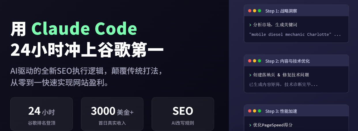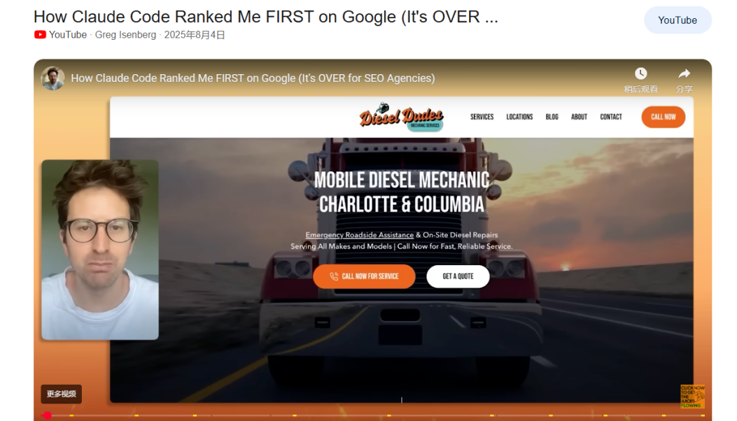 最近,我在油管上看到一個極其震撼的案例:一位名叫James的營銷人,用AI(主要是Claude Code)為一個全新的利基市場網站(卡車維修),在24小時內沖上了谷歌多個核心關鍵詞的前三名,并立即帶來了超過3000美金的真實收入 。如圖:
