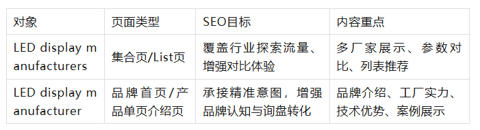 目標:你可以打造一個集合頁/List Page,用于承接“LED顯示屏廠家”類復數關鍵詞搜索,滿足“對比+探索”的用戶需求。