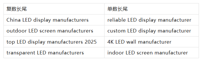 關鍵詞既可以是產品名稱(如“outdoor led display”),也可以是潛在客戶在搜索相關信息時可能輸入的問題(如“how much does outdoor led billboards cost”)。