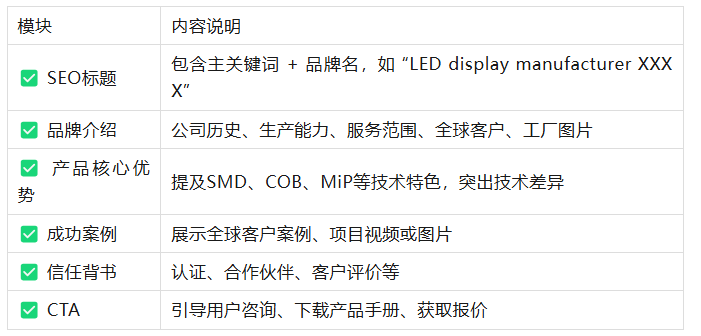 適合建立“著陸頁/欄目頁”:可專門設立“Outdoor LED Display Manufacturer”專題頁;展示產品,生產實力、認證、案例、視頻。
