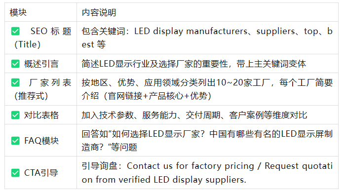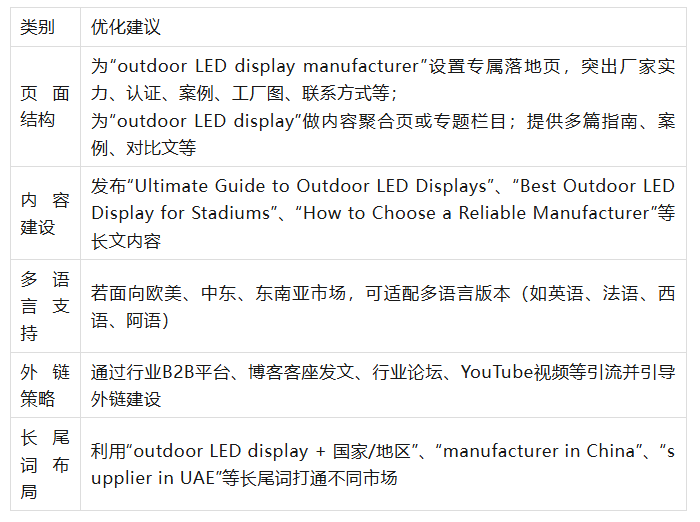 優化“LED display manufacturer” 的SEO策略(單頁/品牌頁)