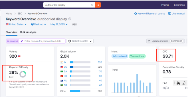 競爭中等偏高:但遠低于“led display”這類泛詞;更容易通過內容與技術SEO獲得排名。