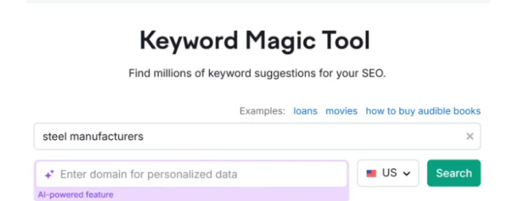 如果您要查找關鍵詞,可以使用 Semrush 的 Keyword Magic Tool 如圖: